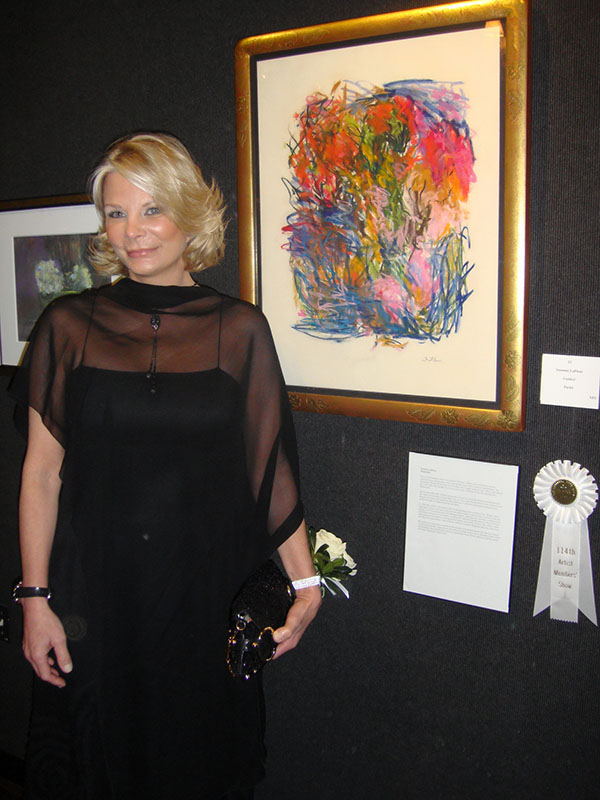 The shift from canvas to paper has opened up doors to many new opportunities.  In late March of this year, Suzanne participated in the National Arts Club‘s 114th Annual Exhibiting Artist Members’ Exhibition. On opening night, her entry titled “Ageless Beauty” was honored with the Flora Giffuni Memorial Award for Pastel.  A pastel on paper work, “Ageless Beauty” explodes in a gestural employment of kinetic line and bold colors.  At the same time, the build up of layers on the paper’s surface creates a contained composition that seems to hover contently in space.  The award was created to honor Flora B. Giffuni, Founder of the Pastel Society of America (PSA).  Established in 1972, the PSA is considered the oldest organization devoted to the medium and is largely credited with the current renaissance of pastels in American art.  This year’s exhibition was produced in memory of visionary painter and print maker Will Barnet.  A longtime member of the NAC, Will Barnet was a bright light within the club and his legacy is sure to live on for years to come.  Hillary Weldon did a great job coordinating the event – it was hard to believe that this was her first year to take on the role.  Her introductions to the various honorees – accompanied with personal, often humorous and heartfelt stories – easily became one of the highlights of the evening.